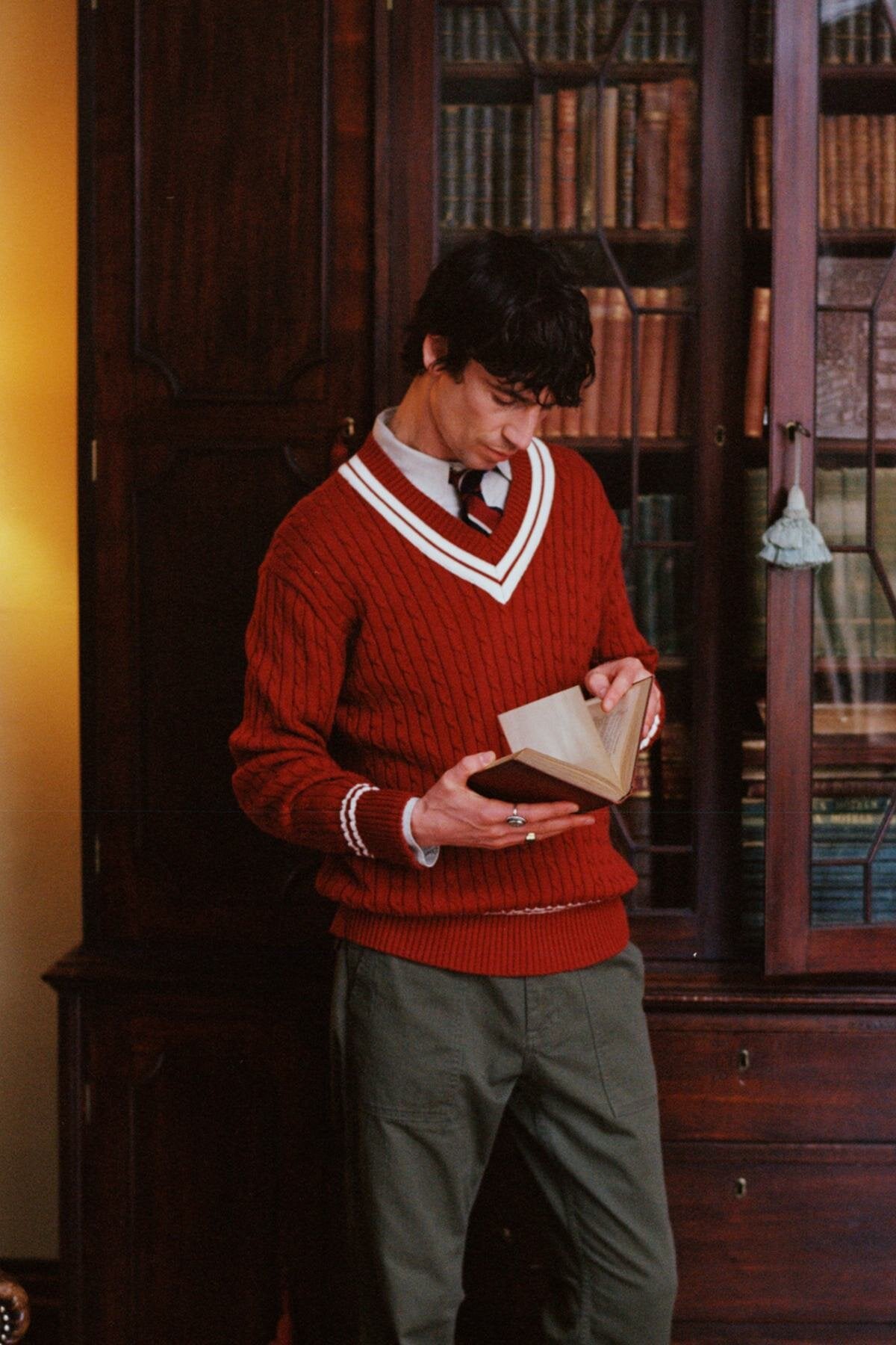 Der Cricket V‑Neck besteht aus 100 % Baumwollstrick im Cable‑Knit‑Design – weich im Griff und zugleich robust genug für den täglichen Einsatz.