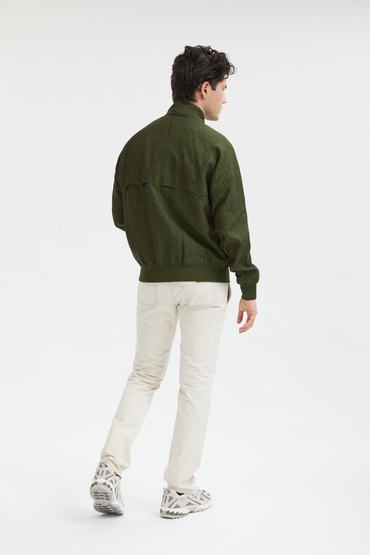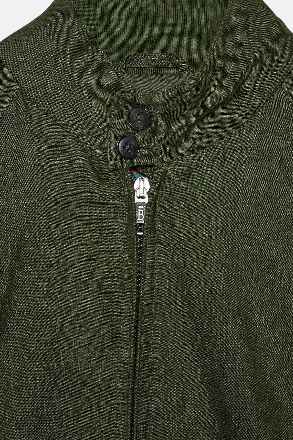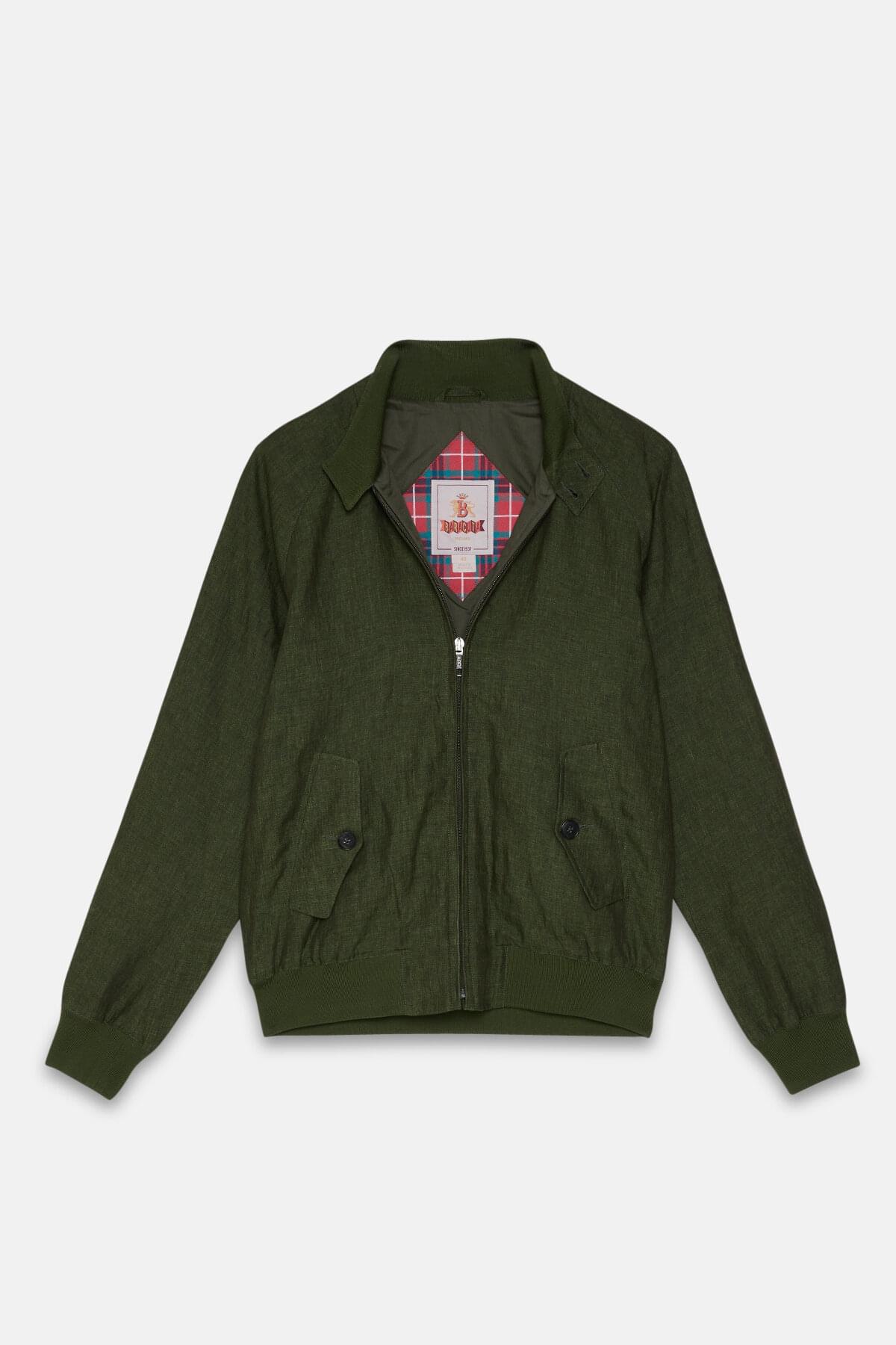 • The G9 Linen is a fresh take on the classic Harrington Jacket, but with a few tweaks to take it up a notch. The jacket maintains all the G9's timeless features like the umbrella back yoke, slanted front pockets, and the signature two-button Baracuta dog ear collar. However, what sets it apart is the 100% pure linen fabric that gives it a contemporary, worn-in appearance. The lining is made of soft 100% cotton, so it feels comfortable to wear. The jacket is completed with some premium touches, such as the metal Baracuta logo on the zip and the exclusive Diamond Fraser label. You'll be mad to let this one slip by!