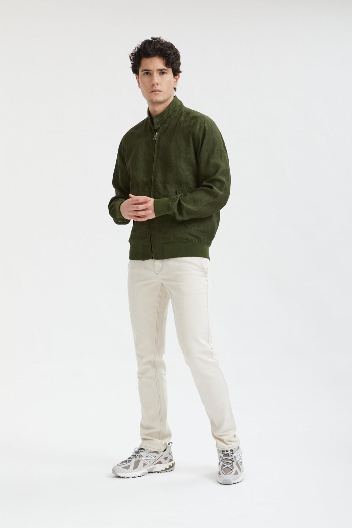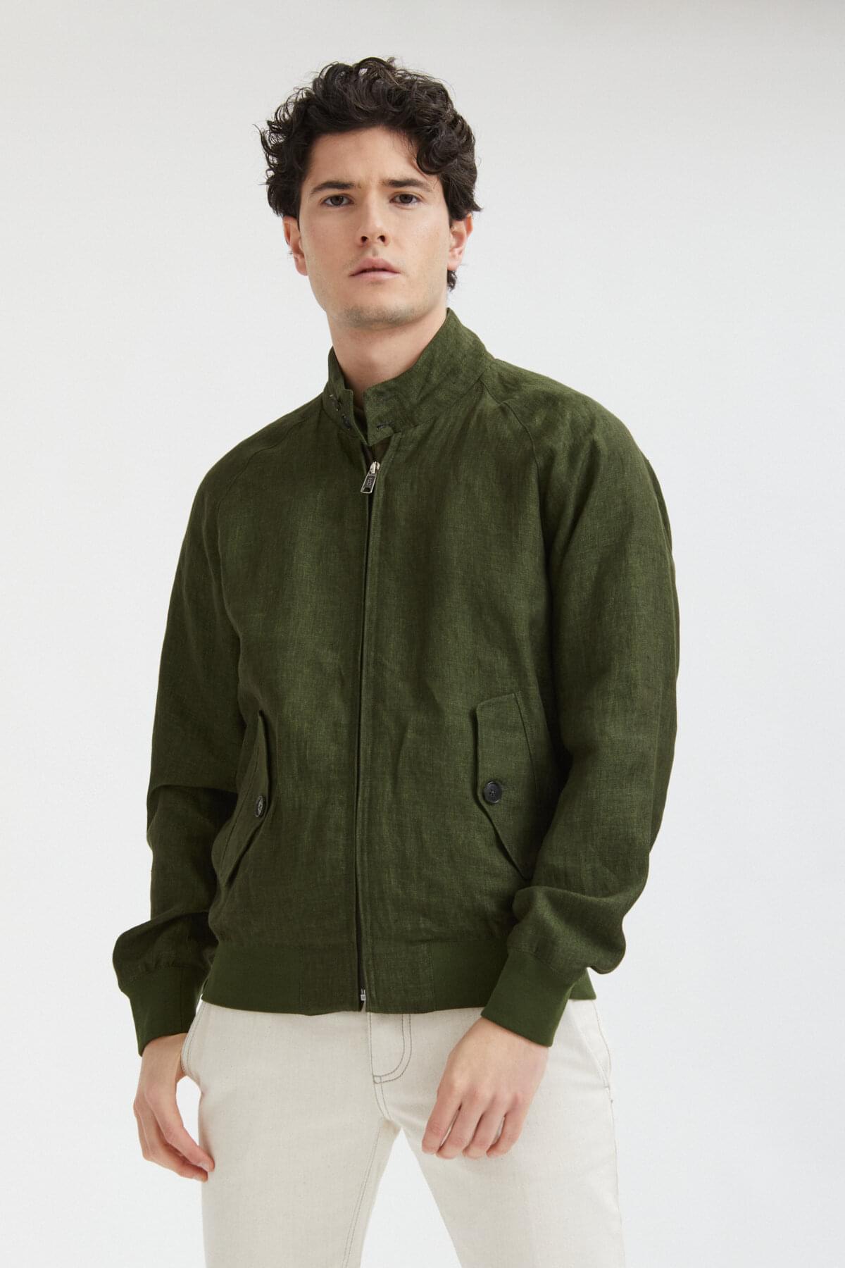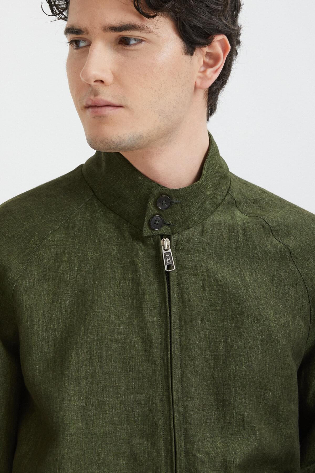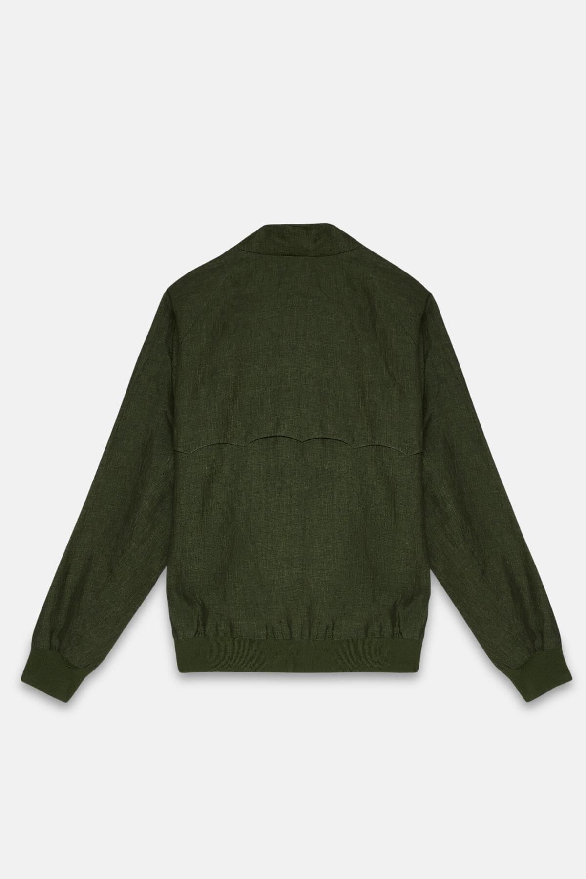 • The G9 Linen is a fresh take on the classic Harrington Jacket, but with a few tweaks to take it up a notch. The jacket maintains all the G9's timeless features like the umbrella back yoke, slanted front pockets, and the signature two-button Baracuta dog ear collar. However, what sets it apart is the 100% pure linen fabric that gives it a contemporary, worn-in appearance. The lining is made of soft 100% cotton, so it feels comfortable to wear. The jacket is completed with some premium touches, such as the metal Baracuta logo on the zip and the exclusive Diamond Fraser label. You'll be mad to let this one slip by!