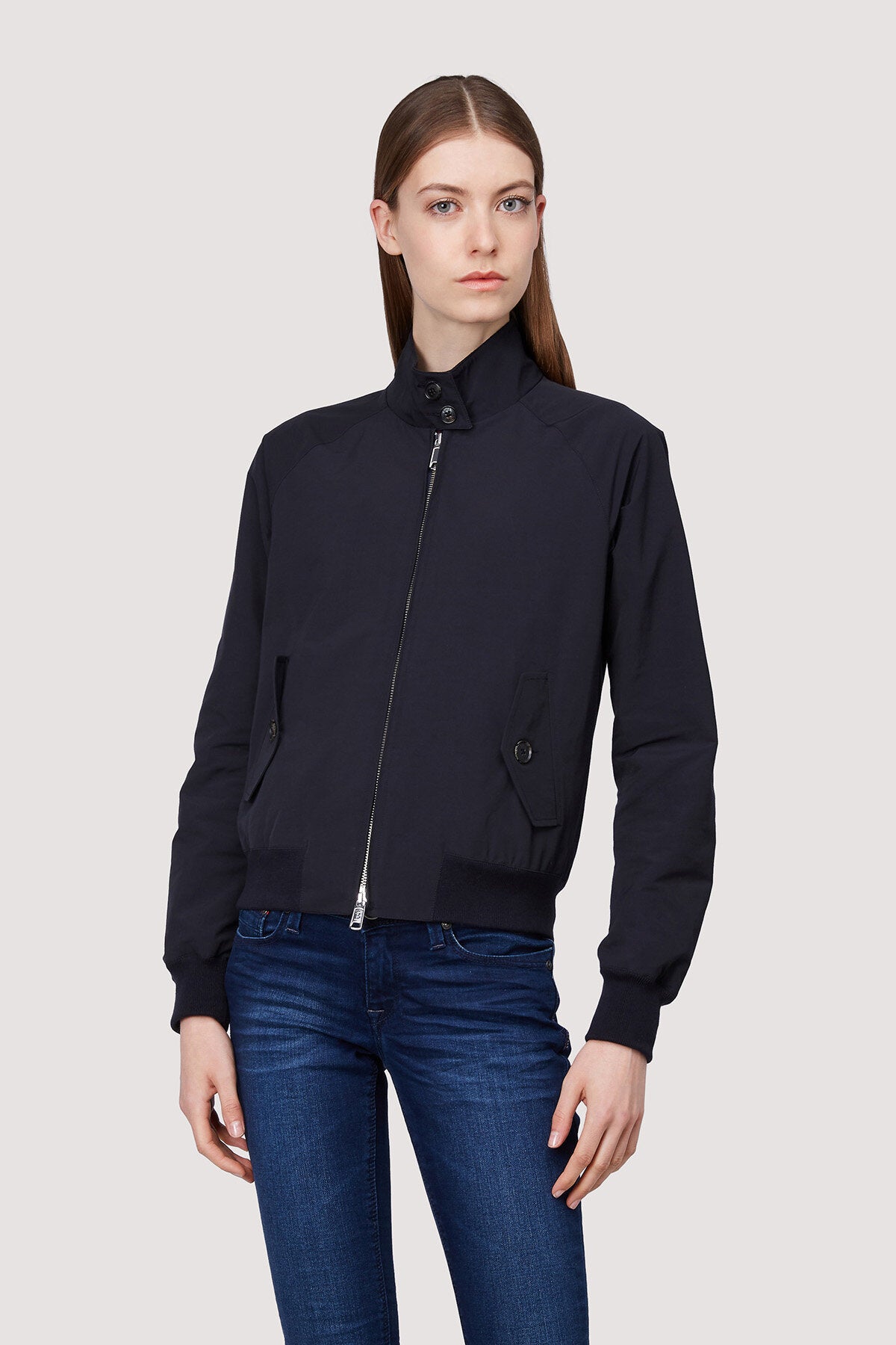 • • Col montant boutonné, intérieur en tissu côtelé ton sur ton, fermeture deux boutons personnalisés Baracuta