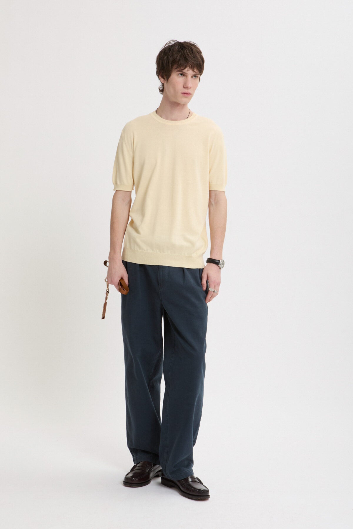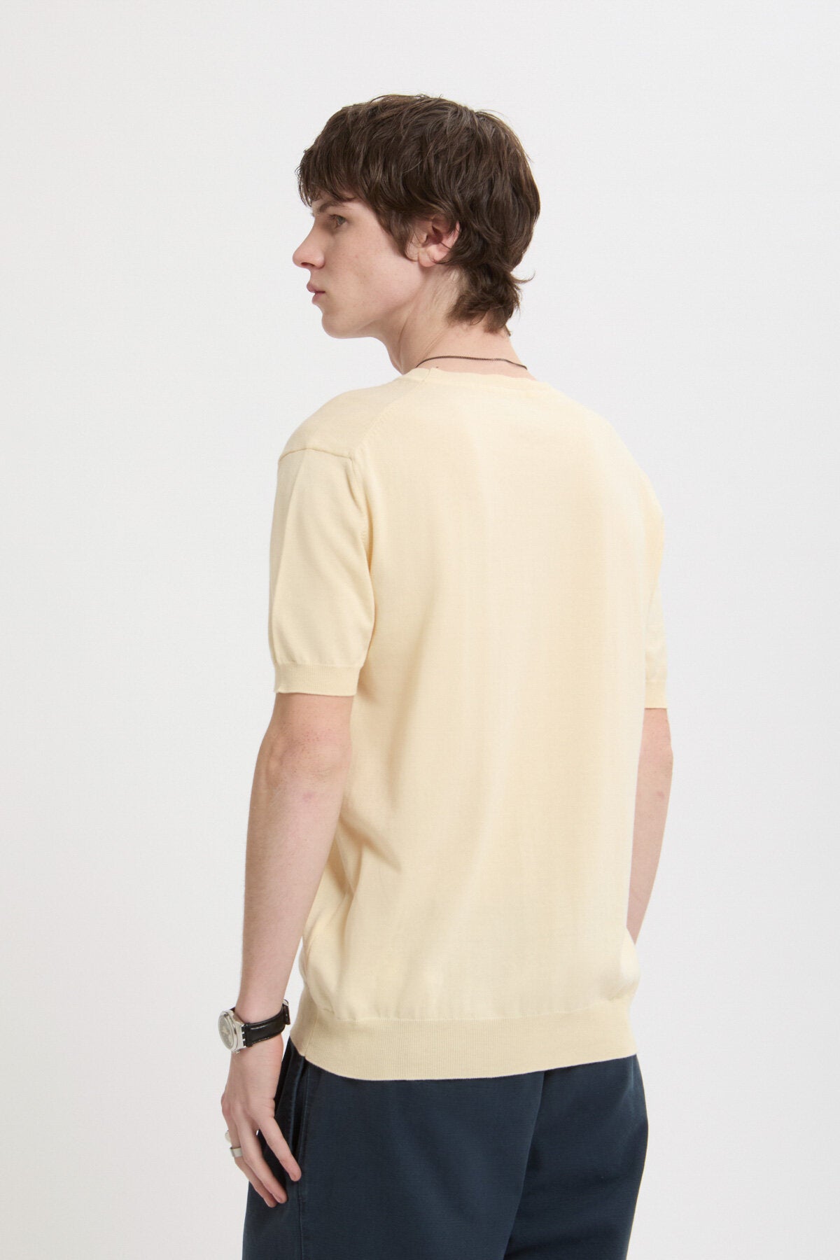 Le T-shirt en maille est fabriqué à en 100 % coton, ce qui lui confère un toucher doux et respirant et une finition nette et structurée.