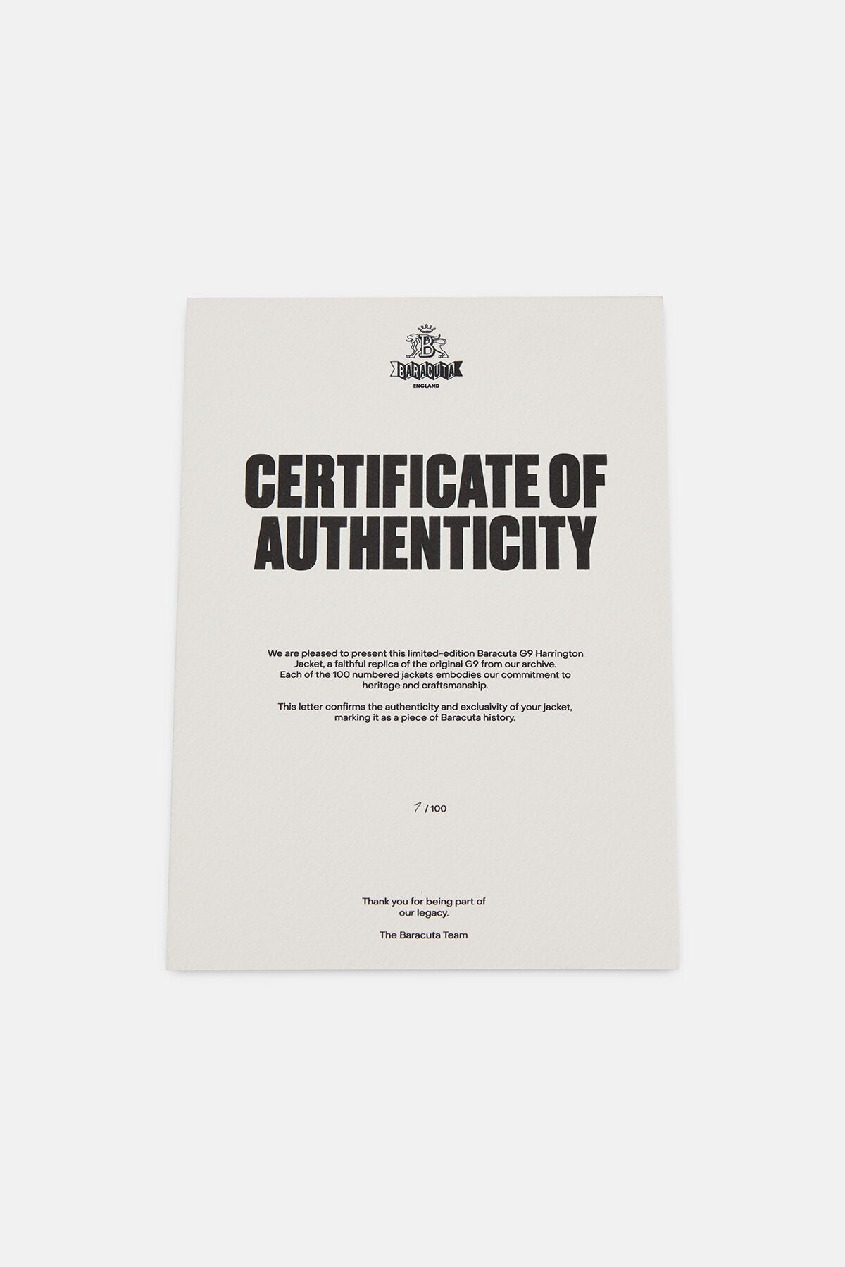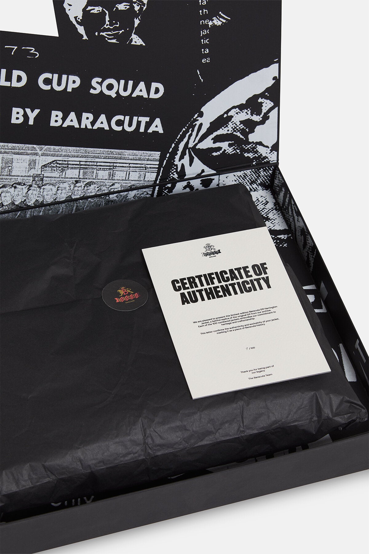 Ognuna delle 100 giacche numerate incarna il nostro impegno per la tradizione e l'artigianato, segnandola come un pezzo di storia Baracuta. Realizzata nel Regno Unito.