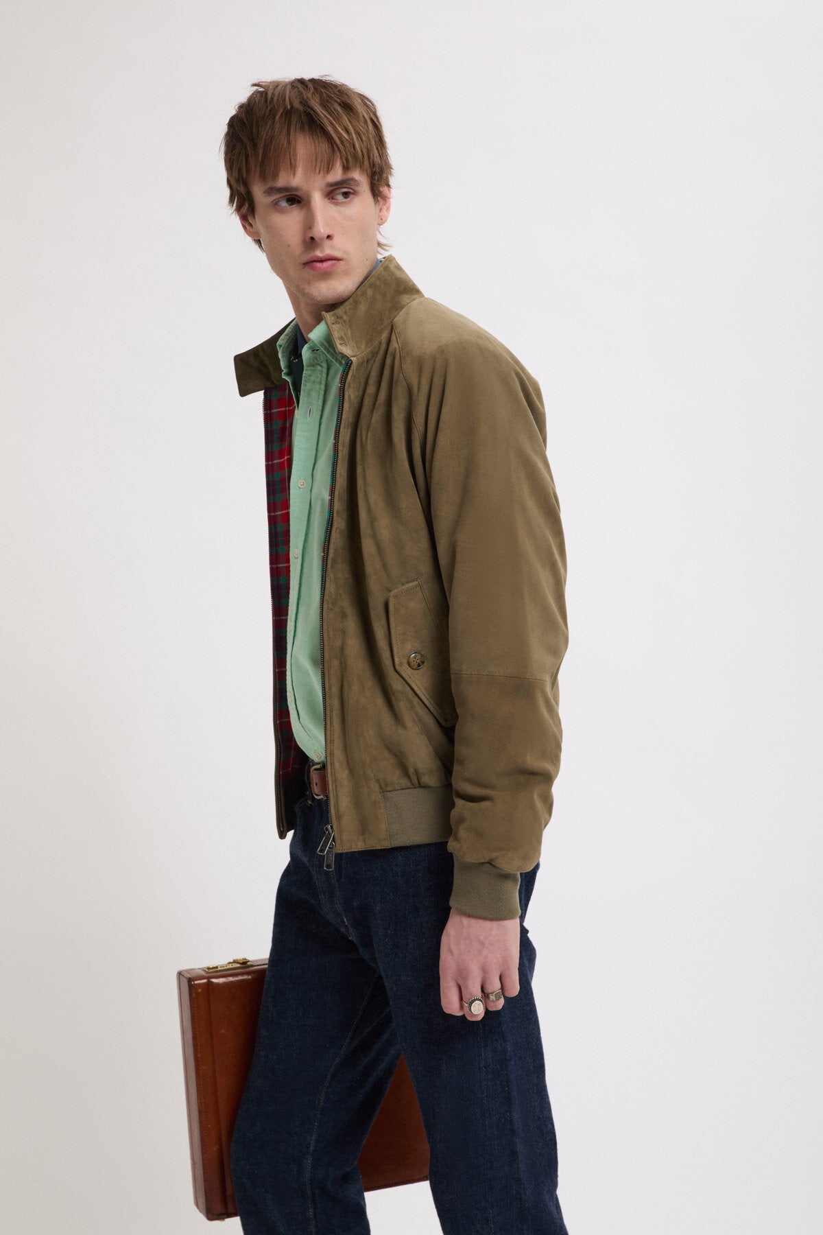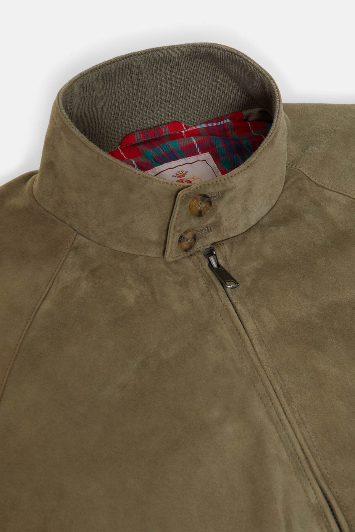 • You can never go wrong with a Suede Jacket. The G9 Suede is the classic Harrington Jacket in fine suede. This garment has made a name for itself and become extremely popular over the years due to its versatility, making it a real style icon. It features our breathable Fraser Tartan lining made from Coolmax® fabric, two-button dog ear collar, slanted side pockets, our signature umbrella back yoke, and ribbed cuffs, waistband and inner collar.