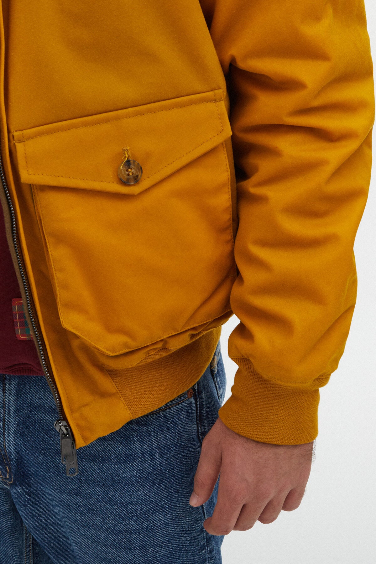 • • Two deep pockets on the front with flap and personalised Baracuta Button closure